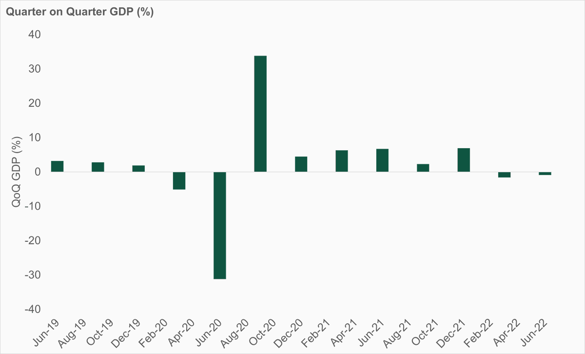 The Federal Reserve (Fed) made a second consecutive 75 bps hike in July, despite market speculation of a 100 bps rise, as annual CPI inflation hit 9.1% in June. While Fed Chair Powell said another 75 bps hike “could be appropriate,” he repeatedly endorsed the Fed’s June Summary of Economic Projections as a good indication of current thinking. This implies another 100 bps of tightening this year, over three meetings, making 50 bps a strong base case for September. Current Fed funds futures contracts are pricing in a 25% probability of a 75 bps hike in September. Meanwhile, the advance Q2 GDP estimate of -0.9% shocked market expectations of 0.4%. This second consecutive negative quarter indicates the US economy is now in recession (see Chart of the Month).