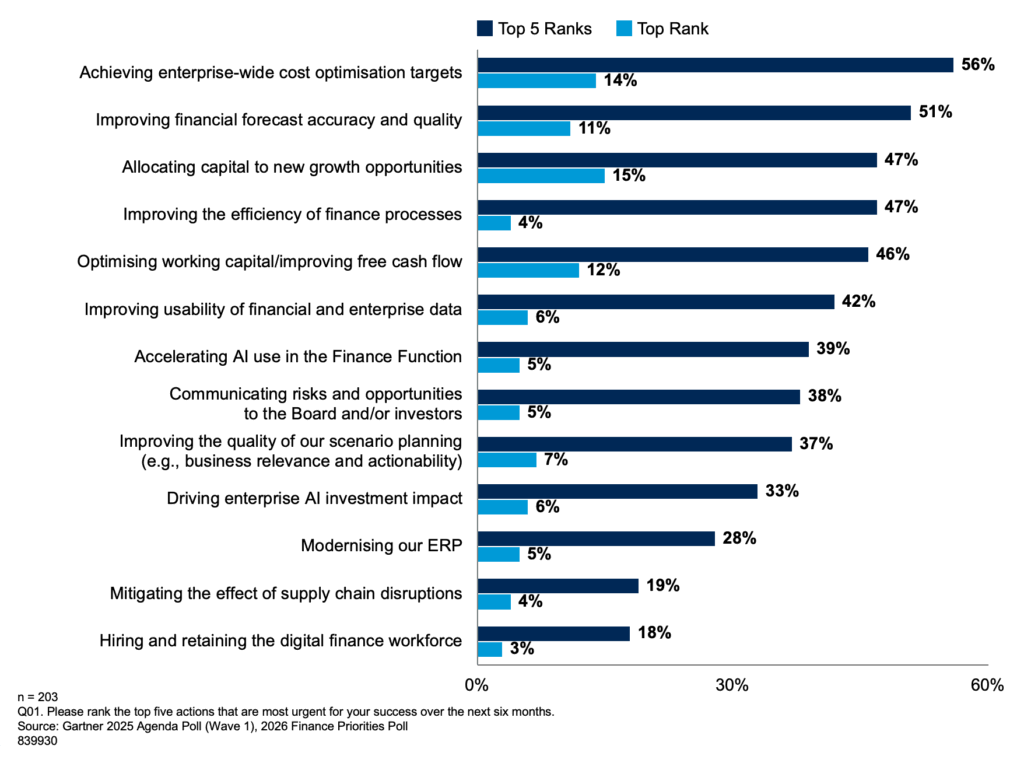 Cost optimisation remains at the forefront of CFOs’ minds, but both investors and boards are increasingly sceptical of cuts that are not sustainable over the long term. Gartner’s research highlights that successful CFOs foster a cost-conscious culture, placing a premium on transparency and financial acumen across the organisation. They are deliberate in directing resources toward business differentiators – those areas that truly set the business apart – while simultaneously reducing spending on functions that competitors can easily replicate.